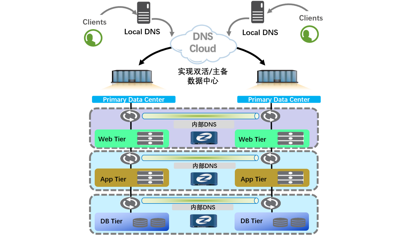 数据中心为提高应用系统的可靠性,实现多站点资源分布式部署,提高资源的利用率,需要多站点的应用系统构建成多活或主备工作模式。为了与IP地址解耦,通常会使用域名系统(DNS)来调度这些应用。富易堂fyt富易堂多数据中心域名(DNS)解决方案以IT整体架构为蓝图,以业务陆续在性保障为目标,利用域名解析门户应用调度功能,可将用户访问流量引流到可靠、可用的数据中心进行访问,既能保证用户的使用体验,又能达到应用容灾的无感切换的目的。